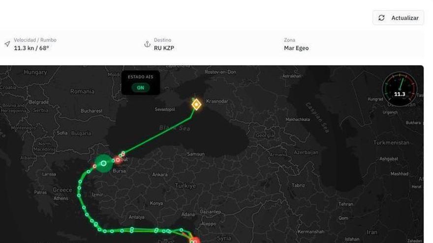 Monitoratge de posicions d’un barco rus en la travessia de Tartús (Síria) Krasnodar, port rus al mar Negre /