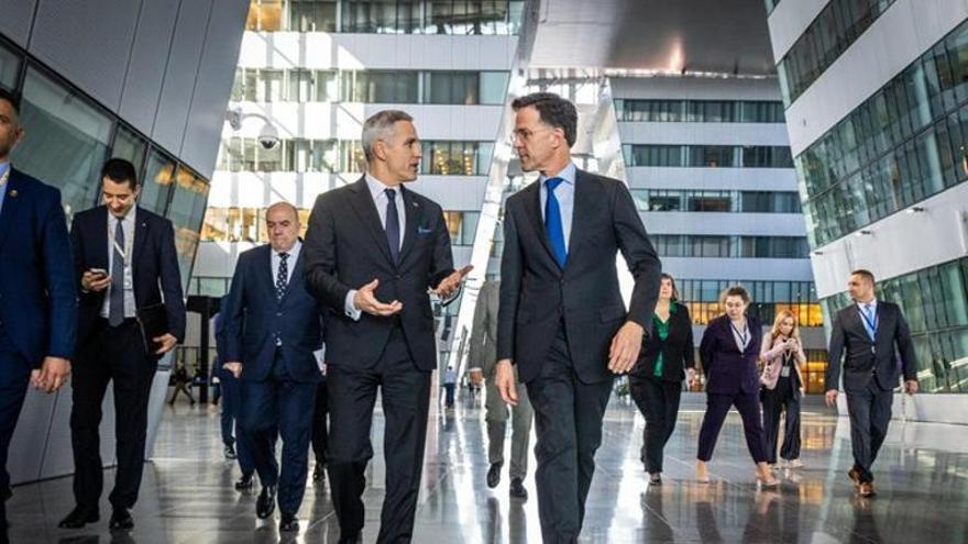 El distòpic interior de la seu de l’OTAN a Brussel·les. A la foto, el secretari general, Mark Rutte, amb el primer ministre búlgar Andrey Burov el 19 de març passat. /