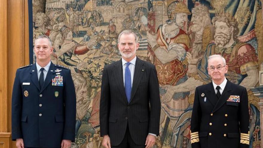 Última visita rebuda a Espanya d’un cap militar de l’Aliança Atlàntica. Alexus G. Grynkewich, comandant suprem aliat (esquerra), al costat del Rei i el cap d’Estat Major de la Defensa, Teodoro Esteban López Calderón, el 25 de març passat /
