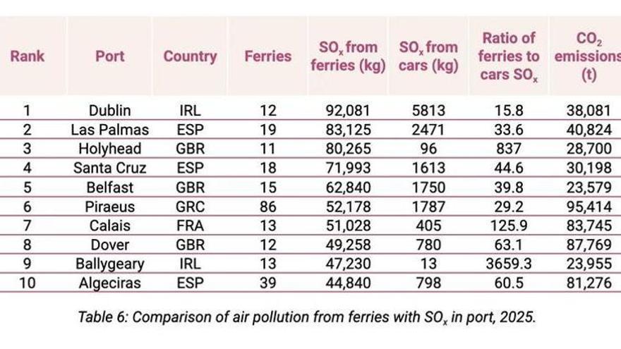 Dublín és actualment la ciutat portuària més contaminada d’Europa per diòxid de sofre (SOx), seguida de Las Palmas de Gran Canaria i Holyhead. Santa Cruz de Tenerife i Algesires figuren també entre els 10 ports més contaminats de la UE.