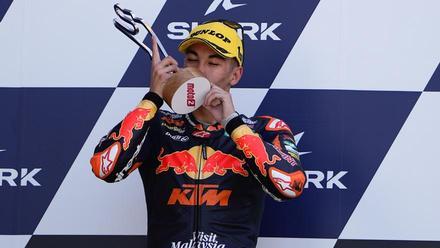 El pilot de KTM, de només 20 anys, va guanyar a Aragó set dies després d’operar-se la mà dreta i va sumar la seva cinquena victòria, a la recerca del rècord (7) de Marc Márquez el 2011