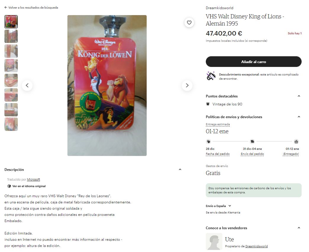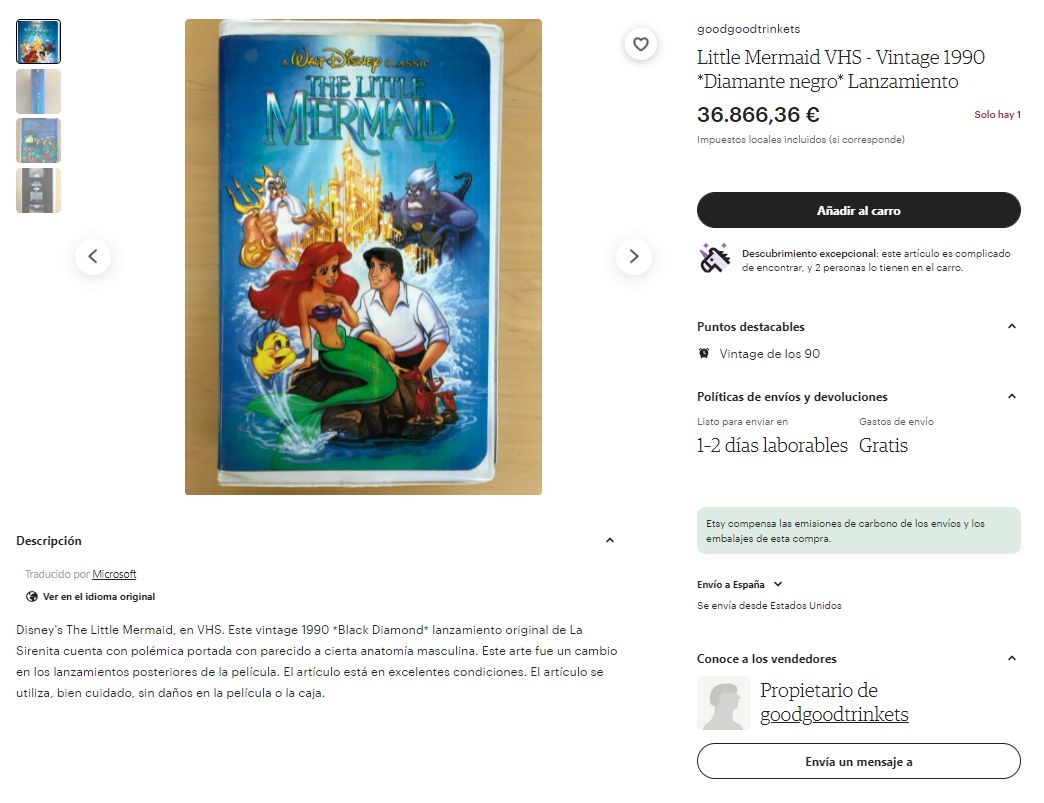 Ara bé, aquesta xifra no és una de les més altes que poden trobar-se a internet. Ni de lluny. A portals com Wallapop o Ebay resulta habitual trobar films als quals només podria accedir una minoria. És el cas, per exemple, dels primers llançaments de La Cenicienta (1950), Aladdin (1992) o Pocahontas (1995), que ascendeixen a 6.349, 1.766 i 1.289 euros. Els tres títols de Disney formen part d’un pack que el seu venedor ofereix per 15.615 euros.