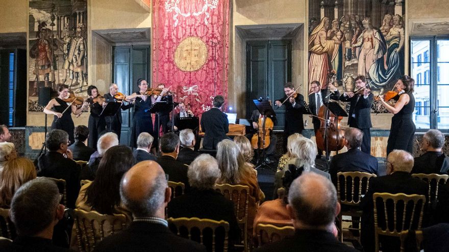 Salvador Illa va acudir a aquest concert amb música de cambra de Corelli, Scarlatti, Händel i Geminiani on va brillar la violinista Farran Sylvan James molt ben conjuntada amb la resta de la formació liderada per Espasa al clavecí en una sala de l’impressionant palau renaixentista que dona a la plaça Espanya de la capital italiana. Envoltada d’enormes tapissos i amb un mapa al sostre que representava el Tractat de Tordesillas, l’orquestra d’Espasa va transportar el públic al segle XVII.
