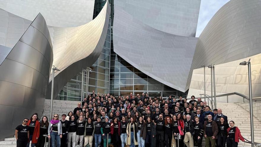 Els cantaires de l’Orfeó Català i el Cor de Cambra, davant el Walt Disney Concert Hall. /