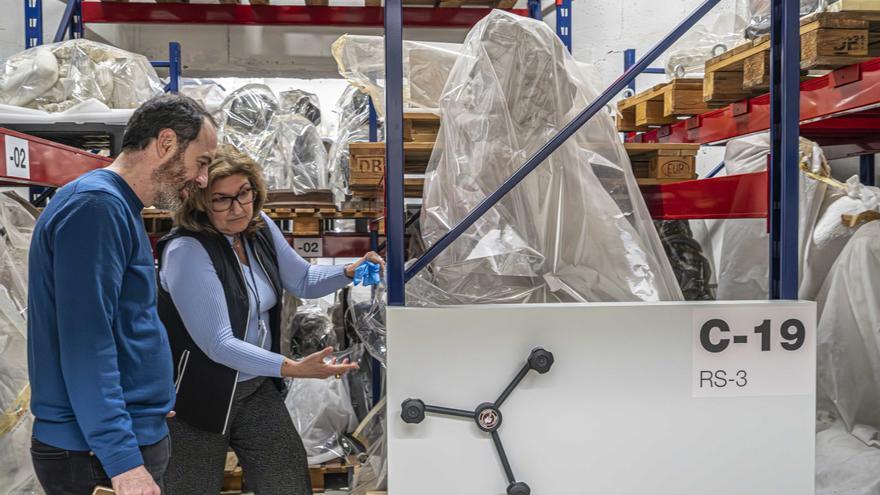 El que no veu, tret que se sumi en alguna de les visites guiades que s’organitzen de tant en tant, són la vintena de sales que, repartides aquí i allà, esgarrapant metres on poden, conserven de manera individualitzada cadascun dels diferents suports. La fotografia en color, per exemple, necessita fred polar, mentre que la pintura i les baixes temperatures no casen gaire bé. El mateix passa amb l’escultura policromada, molt més delicada que les estàtues i els bustos el pes dels quals va obligar a reforçar amb malla d’acer el terra de l’hangar destinat a les anomenades obres de tècnica inorgànica, colossos silents de pedra, marbre, ceràmica, terracota. "Si multipliques tots els nivells, aquest metre quadrat potser està suportant 3 tones de pes", explica Tena mentre assenyala una filera de palets plens d’escuts nobiliaris en pedra, motlles per a bronzes i escultures guardonades dècades enrere amb medalles d’or i selectes distincions de les exposicions universals.