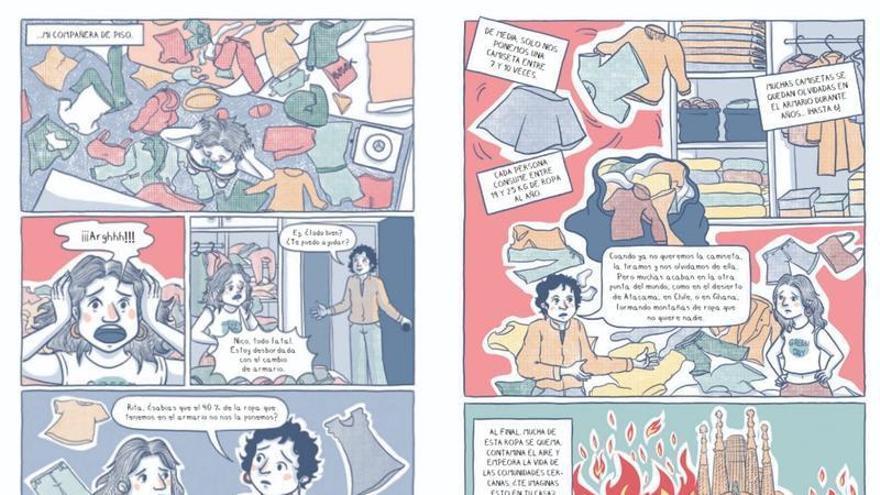 El punt de partida és quotidià. Dues amigues que comparteixen pis. Una consumidora habitual de cadenes ‘low cost’ i una dissenyadora crítica amb el sistema. La història de Rita i Nico –guionitzada per Anna Llarch i il·lustrada per Panchulei– funciona com a mirall generacional. A través de la seva transformació, el còmic intercala vinyetes amb dades i infografies que radiografien el model dominant: el del ‘fast fashion’.