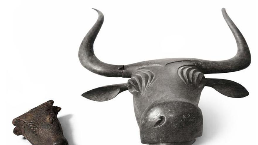 A l’esquerra, el cap de bou en miniatura acabat de trobar per un excursionista en un camí de Valldemossa. A la dreta, els trets d’un dels bous de Costitx, trobats a son Corró i exposats al Museu Arqueològic Nacional, guarden similitud amb la peça ara localitzada a la serra de Tramuntana. /