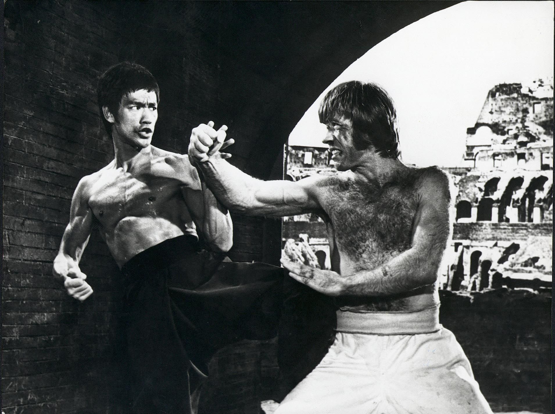 Imatge de la pel·lícula El furor del drac amb Bruce Lee i Chuck Norris, original en blanc i negre /