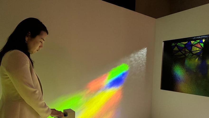 Finalment, l’últim espai de la mostra és una interacció digital per experimentar com canvia l’espai en funció de la llum que entra per les finestres. Això s’observa a partir d’un sistema informatitzat que permet crear diferents focus amb diferents formes i colors als vitralls.