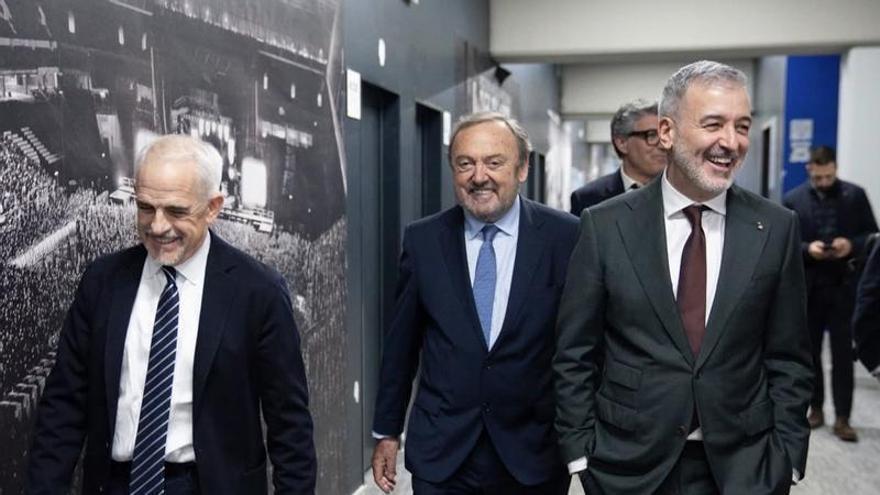 L’alcalde Jaume Collboni al costat del president de Sport Cultura Barcelona, Josep Mateu, i el president de l’Espanyol, Alan Pace. /