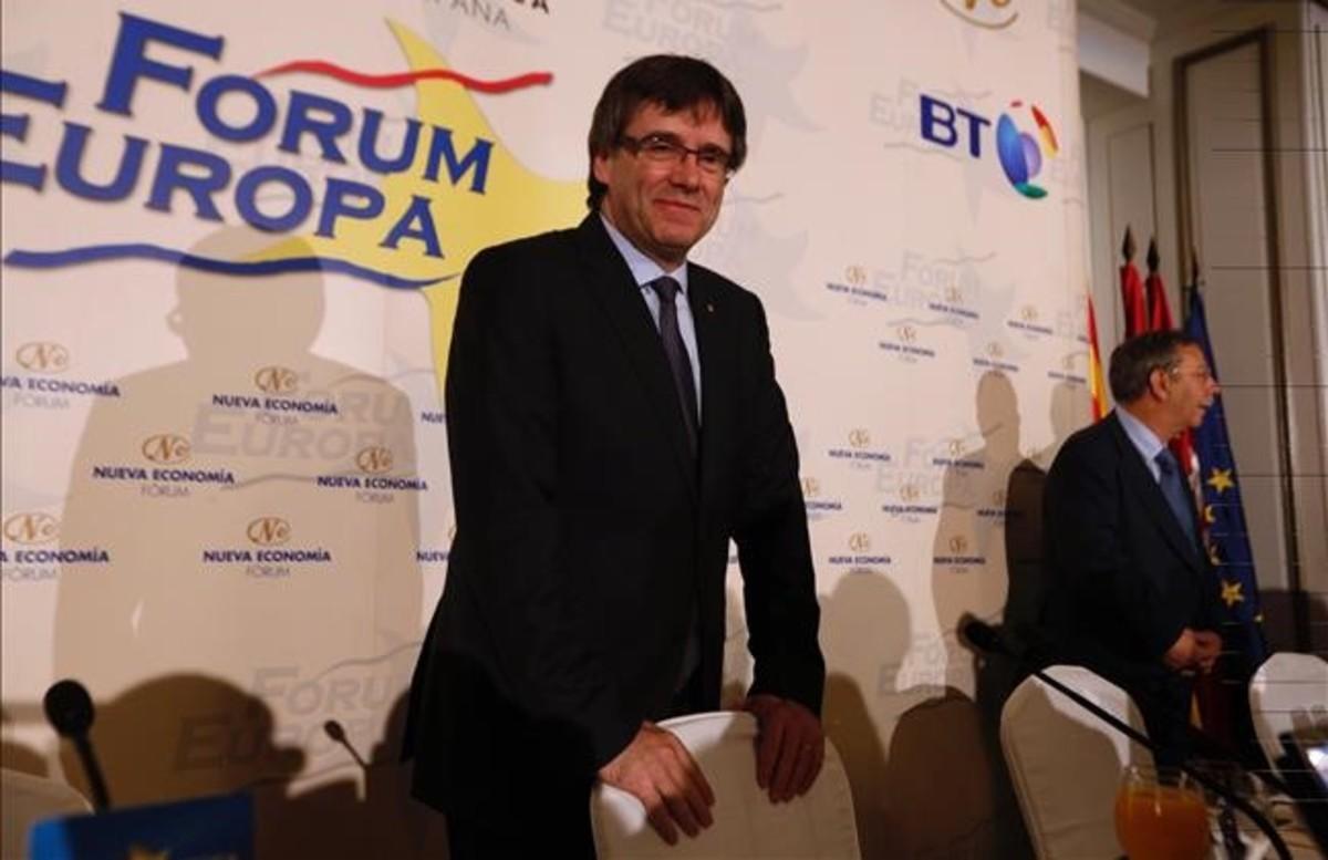 “Acordem una consulta que satisfaci les dues parts i doni sortida a la reivindicació del poble de Catalunya. Posem-nos d'acord en la data, la pregunta, el quòrum i la moratòria que s'hauria d'aplicar per convocar una nova consulta. La consulta és irrenunciable”, ha defensat Puigdemont, que també s'ha mostrat obert que aquest referèndum no només pregunti sobre la independència, sinó també sobre altres formes d'organització, com el federalisme. Però la seva disposició a negociar, ha subratllat, no implica cap marxa enrere en el full de ruta independentista. Al contrari. “No ens quedarem amb els braços plegats. Parlàvem de 18 mesos i estem en condicions de complir-ho. En aquest temps hi haurà noves eleccions que elegiran un Parlament que redactarà la Constitució, convocarà un referèndum i declararà la independència”, ha explicat al Fòrum Europa Puigdemont, per a qui “la immensa majoria de la població catalana ni vol desentendre's d'Espanya ni vol entendre's d'aquesta manera”.