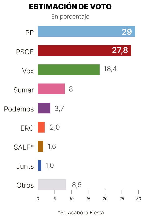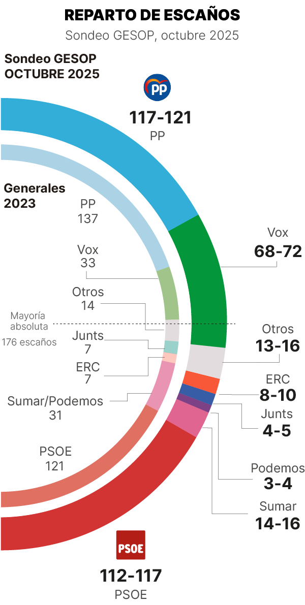 En cas de celebrar-se ara eleccions generals, el PP obtindria el 29% dels vots i 117-121 escons (avui en té 137), cosa que significa que ha perdut 1,5 punts des del juny i 3,7 punts des dels comicis del 2023. Es tracta de la pitjor dada dels últims tres anys en els sondejos del GESOP. El PSOE, per la seva banda, aconseguiria el 27,8% dels sufragis i 112-117 diputats (ara en té 121), vuit dècimes més que al juny, però 3,6 punts menys que a les urnes. En realitat, respecte a l’enquesta anterior, Sánchez es mou en una forquilla d’escons molt similar, però el fet que Feijóo es deixi una quinzena de diputats fa que tots dos quedin gairebé empatats.