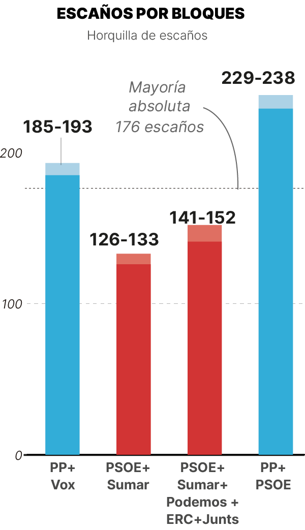 L’altre factor que acosta el PSOE al PP és, clarament, l’auge de l’extrema dreta. Vox és l’única formació que milloraria de manera substancial els seus resultats en relació amb les eleccions del 2023, a l’assolir el 18,4% dels vots i 68-72 escons (avui en té 33). Els ultres han escalat 2,4 punts més des del juny i obtindrien sis punts més que en els últims comicis. La dreta sumaria, per tant, el 47,4% de les paperetes i una majoria absoluta que podria arribar fins als 193 diputats, cosa que deixaria l’esquerra sense opcions de mantenir el Govern.