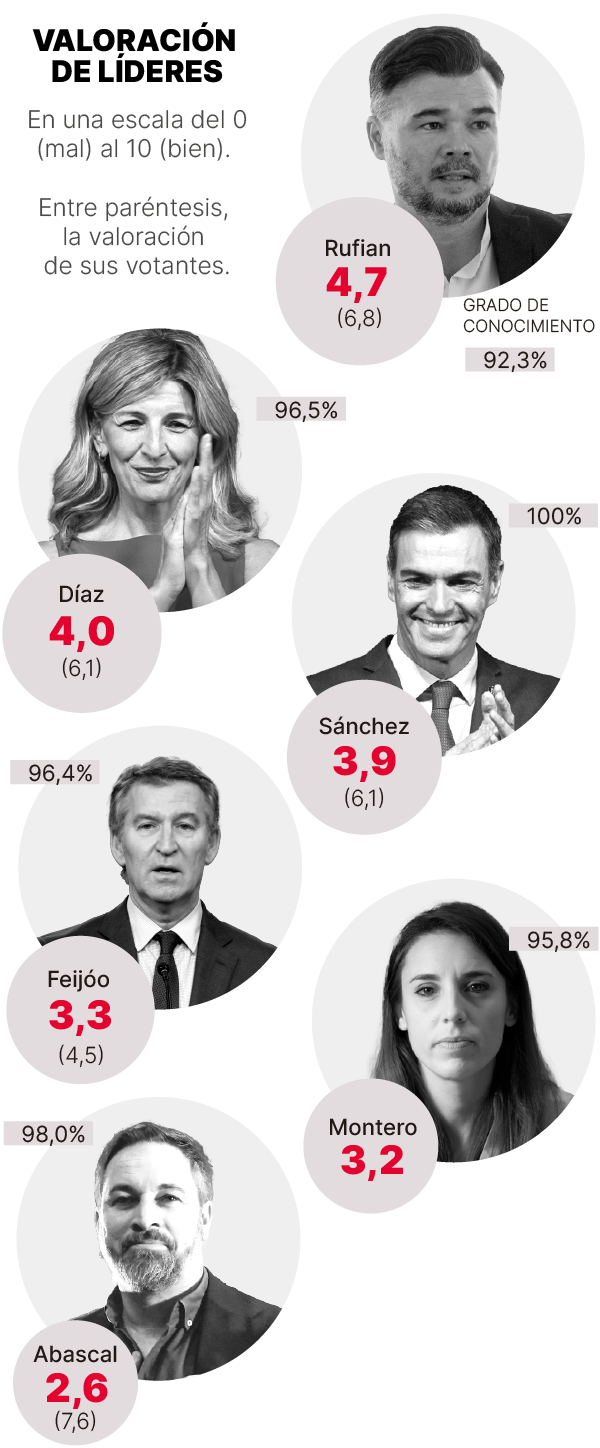 Notícies relacionadesMés enllà del suspens general que tornen a atorgar els espanyols a tots els líders, Sánchez millora lleugerament i obté la millor valoració de l’últim any (3,9), mentre que Feijóo continua a la baixa (3,3) i només aprova entre els seus propis votants (5,5). L’electorat socialista puntua amb un 6,1 Sánchez, i el de Vox, amb un 7,6 a Abascal. Per primera vegada, el GESOP ha preguntat pel republicà Gabriel Rufián, que debuta amb bastant èxit: és el més ben valorat en general (4,7) i aprova en els electorats de Sumar (6,9), ERC (6,8) i el PSOE (6,2).