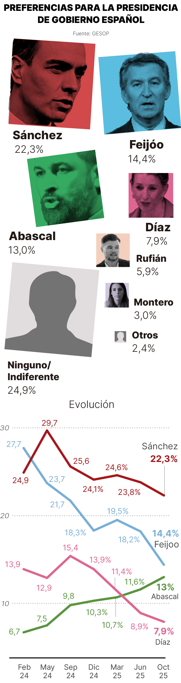 En aquest context, l’Enquesta Política d’Espanya del Gabinet d’Estudis Socials i Opinió Pública (GESOP) per a Prensa Ibérica reflecteix una lleugera recuperació del PSOE després de diversos mesos de caiguda, un retrocés important del PP i un nou rècord de Vox que deixa els populars i els socialistes en un empat tècnic. L’avantatge de Feijóo sobre Sánchez ha passat de 3,5 a només 1,2 punts en els últims quatre mesos, tot i que el bloc de la dreta manté una clara hegemonia impulsat pel creixement de Santiago Abascal, que ja superaria el 18% dels vots i duplicaria la seva representació al Congrés.