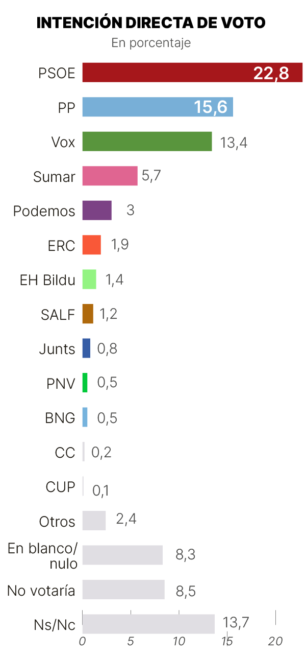 Per entendre l’erosió del PP i la recuperació del PSOE en els últims mesos cal observar altres indicadors de l’enquesta, com la intenció directa de vot (el vot sense ‘cuina’). Feijóo se situa en el seu mínim des que presideix el partit (15,6%), només dos punts per davant de Vox (13,4%) i a set punts del PSOE (22,8%). Fa un any, els populars tenien un avantatge de 13 punts sobre els ultres i de punt i mig sobre els socialistes. El treball de camp de l’enquesta es va elaborar, a partir de 1.000 entrevistes, del 3 al 9 d’octubre, coincidint amb debats com les represàlies contra Israel per la guerra a Gaza, el pla d’immigració de Feijóo i l’embolic del PP amb l’avortament.