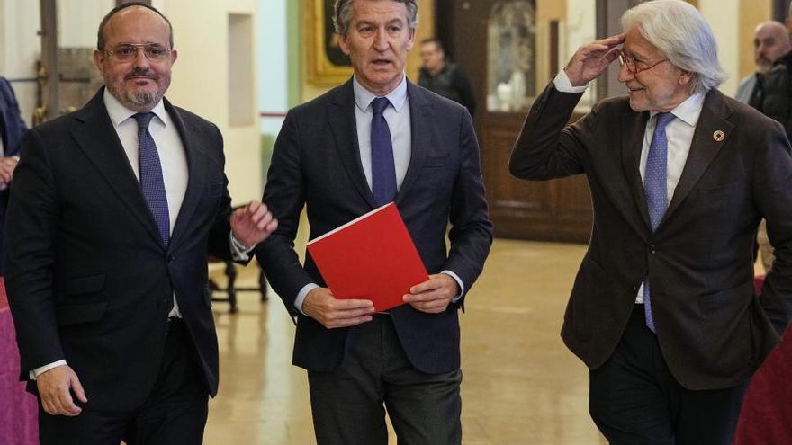 El president del PP català, Alejandro Fernández, el president del PP, Alberto Núñez Feijóo, i el president de Foment, Josep Sánchez Llibre, durant un acte a Barcelona /