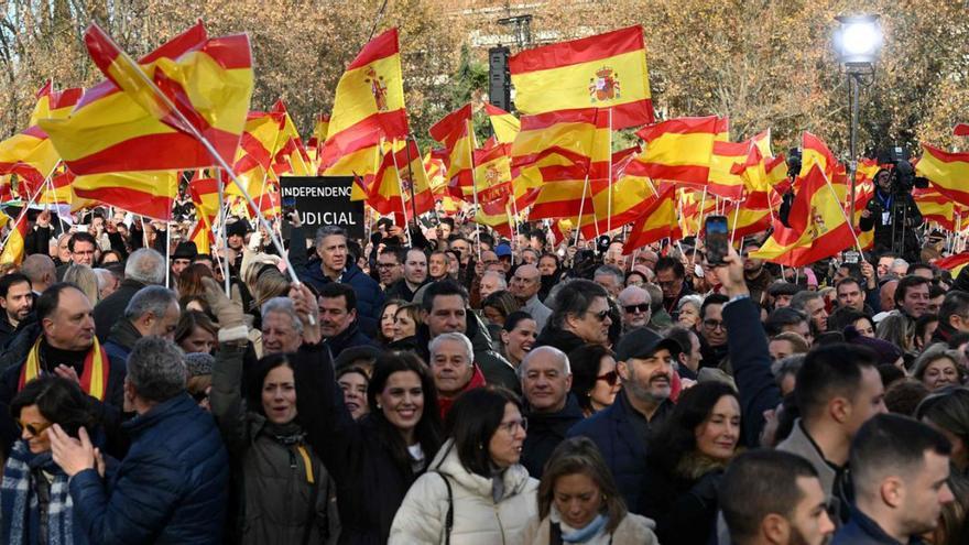 "El sanchisme és a la presó i ha de sortir del Govern", va reiterar Feijóo, com ja va fer dijous al convocar aquesta manifestació. El líder de l’oposició va començar el discurs proclamant que "defensar Espanya és l’honor més gran" i tot seguit assegurant que "som aquí per defensar la llibertat, la democràcia i la Constitució".