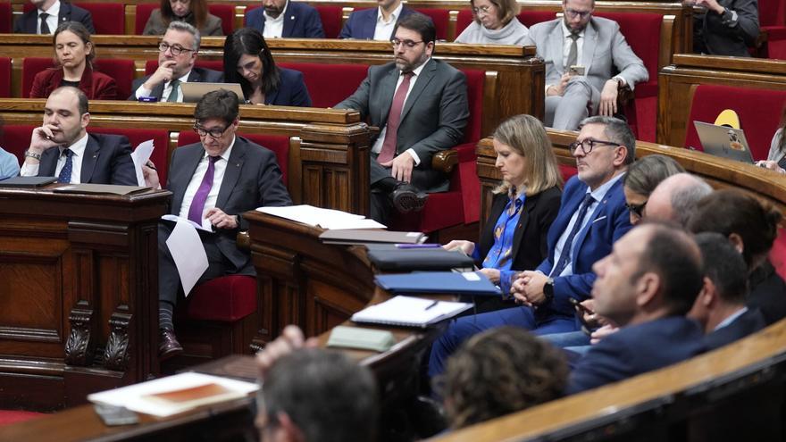 El president de la Generalitat, Salvador Illa, membres del Govern i diputats, a l’hemicicle del Parlament. /