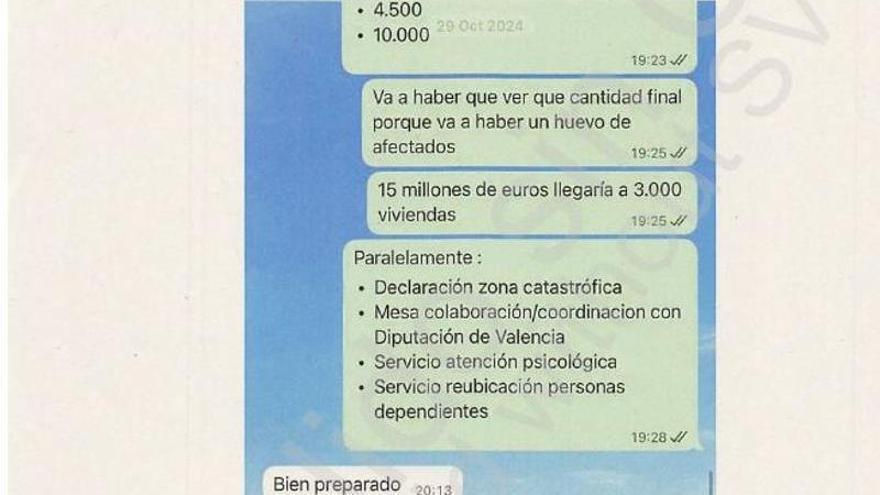 Tot i que hi va haver dues parts que Cayetano García «va oblidar» llegir. L’al·lusió al govern del Botànic. «A l’anterior dana del 2019 el Botànic en va donar 4.500 i 10.000». I la referència a l’elevat nombre d’afectats de la dana que ja intuïen. «S’haurà de veure quina quantitat final perquè hi haurà un ou d’afectats», escriu García Ramírez a Mazón a les 19.25 hores.