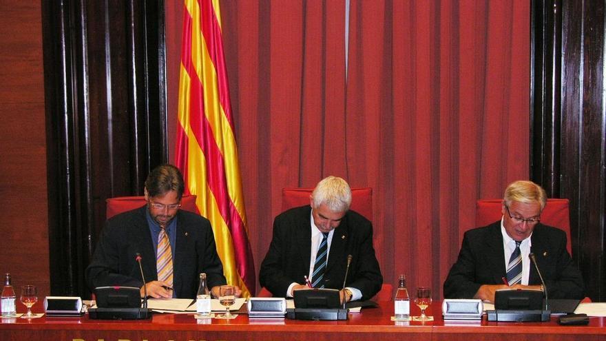 El president de la Generalitat, Pasqual Maragall, el del Parlament, Ernest Benach, i l’alcalde de Barcelona, Joan Clos, han firmat aquesta tarda un conveni marc de col·laboració entre el Govern, el Parlament i l’Ajuntament per a l’ampliació de la seu de la cambra catalana (20 de juliol de 2006) /