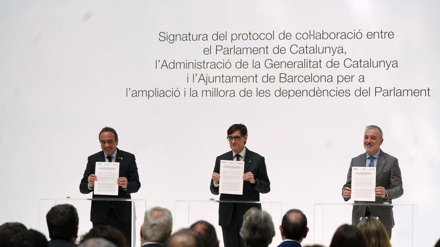 Els dos edificis –l’actual i el nou annex– estaran connectats directament, tal com ha explicat el president del Parlament, Josep Rull, durant l’acte de presentació oficial del protocol. L’esdeveniment s’ha celebrat a l’Auditori Lluís Companys de la Cambra catalana i ha comptat amb la presència del president de la Generalitat, Salvador Illa, i de l’alcalde de Barcelona, Jaume Collboni, que, al costat de Rull, han subscrit aquest marc de col·laboració perquè el Parlament guanyi capacitat amb una previsió de sis a vuit anys vista, segons fonts coneixedores, tot i que sense un calendari definit.