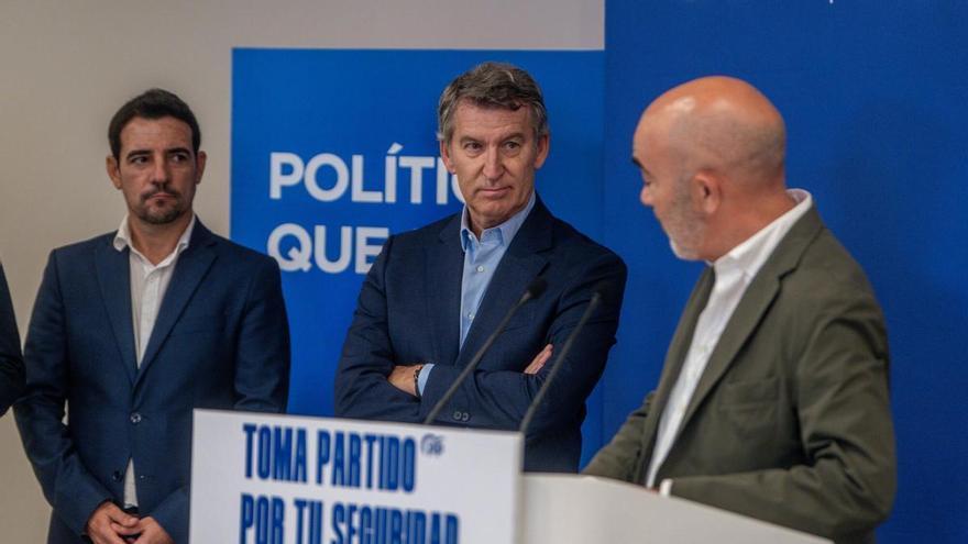 El presidentdel PP, Alberto Nñe Feijóo, després de la reunió per tractar temes de seguretat amb el portaveu del PP a l’Ajuntament de Barcelona, Daniel Sirera i el president provincial del PP de Barcelona, Manuel Reyes. /