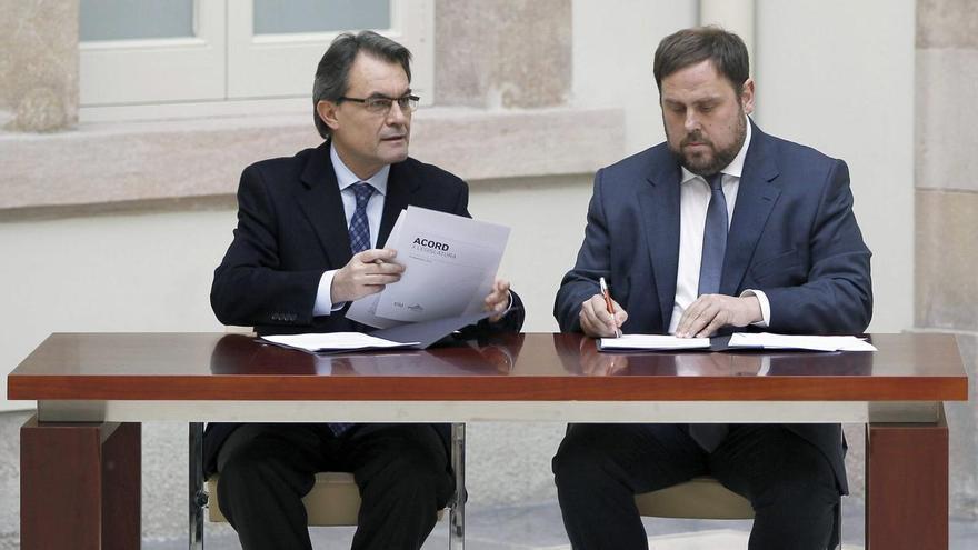 Artur Mas i Oriol Junqueras, firmant l’acord de governabilitat assolit entre CiU i ERC el desembre del 2012 /