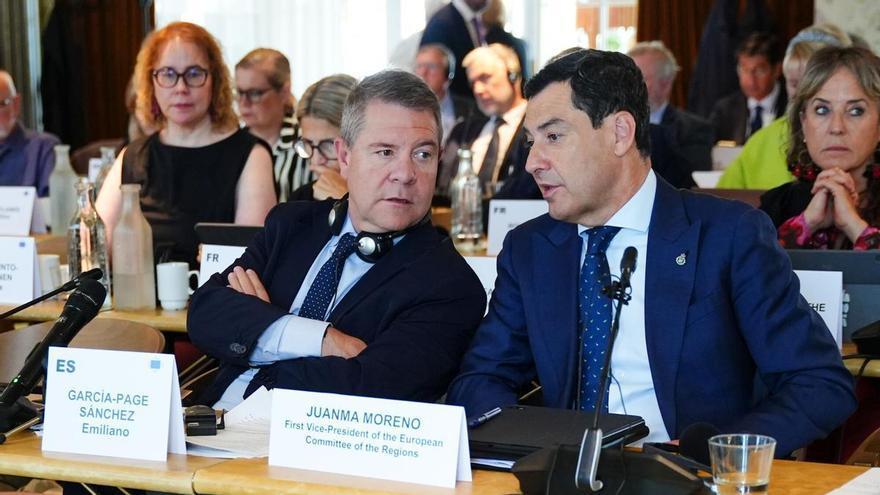 Els presidents de Castella-la Manxa, Emiliano García-Page, i d’Andalusia, Juanma Moreno, en la Conferència de Presidents del Comitè de les Regions del 2025 a Helsingør, Dinamarca. /