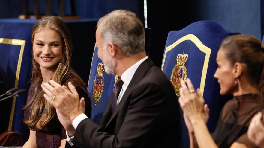 Elionor i els seus pares, el 24 d’octubre del 2025, als premis princesa d’Astúries al teatre Campoamor, a Oviedo. /