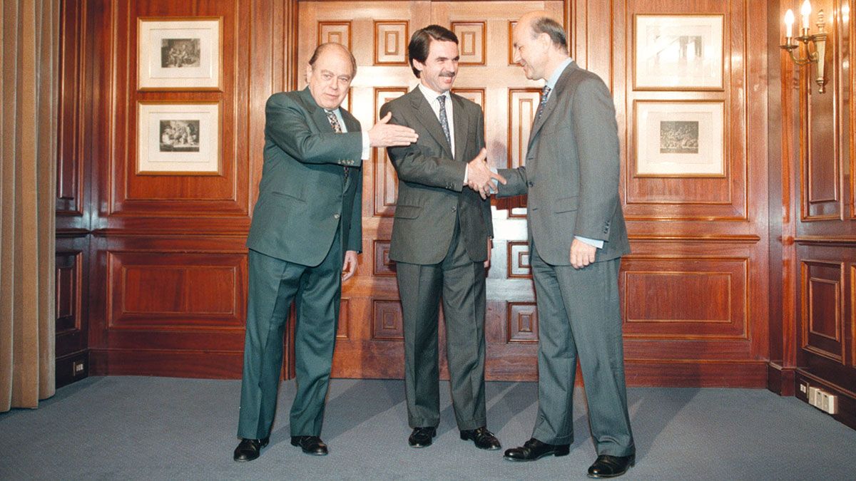 Jordi Pujol, José María Aznar i Josep Antoni Duran Lleida, després de signar el pacte del Majestic, el 28 d'abril de 1996. Foto: Julio Carbó
