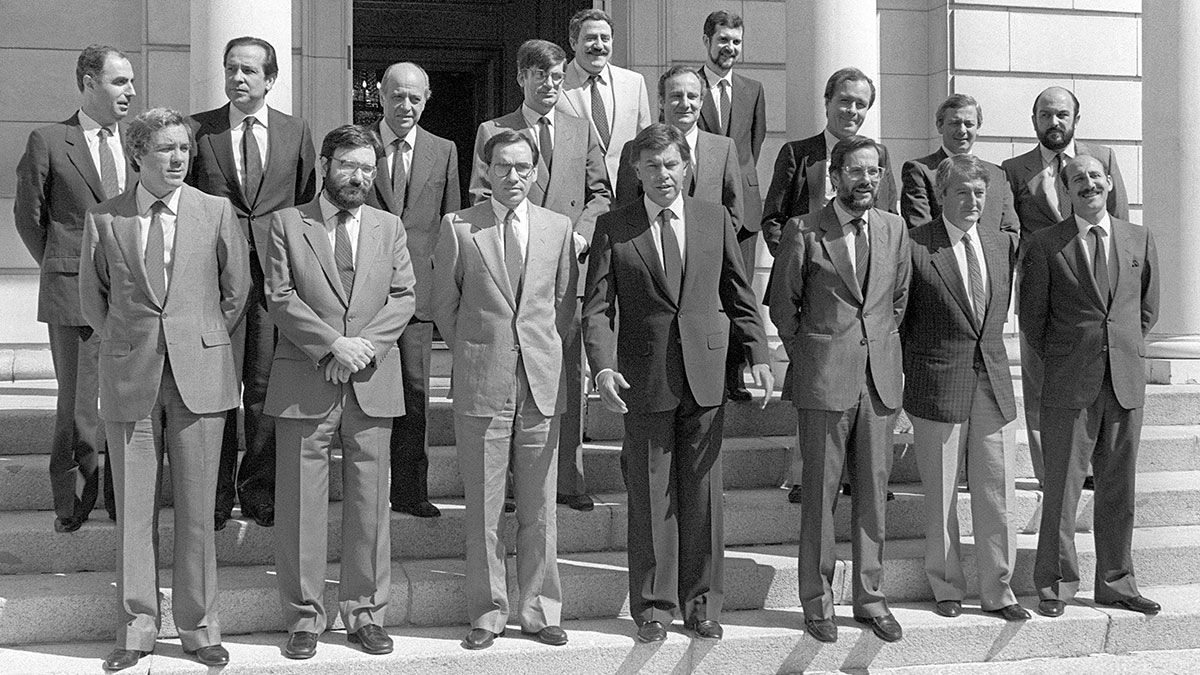 El segon Govern de Felipe González, amb Narcís Serra (segon per l'esquerra a la filera inferior) i Ernest Lluch (quart per l'esquerra a la filera superior), el 5 de julio de 1985.