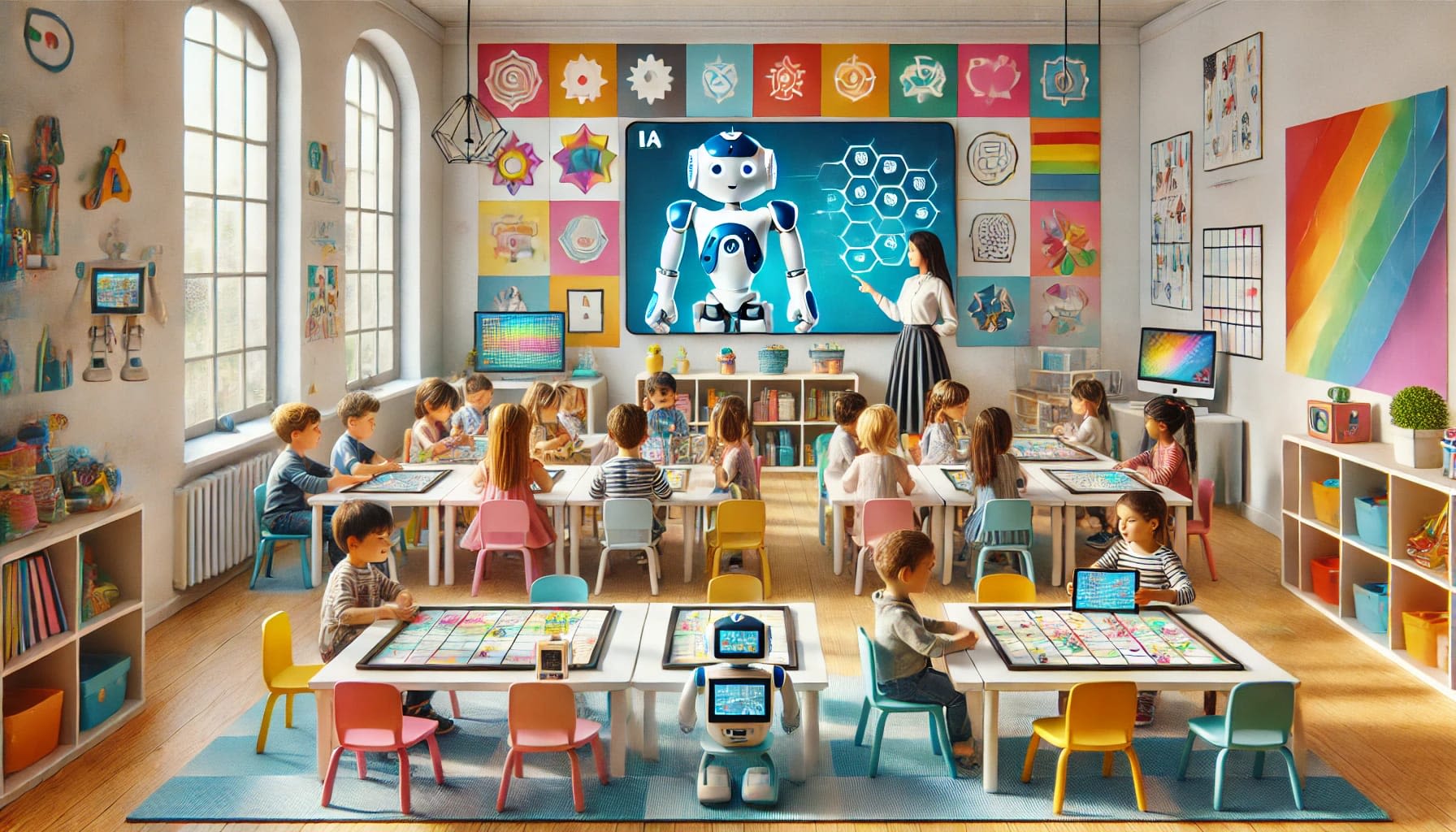 Il·lustració feta amb ChatGPT en què se li ha demanat que dibuixi "con seria una classe de primària a Catalunya on els nens aprenen a fer servir la Intel·ligència Artificial".