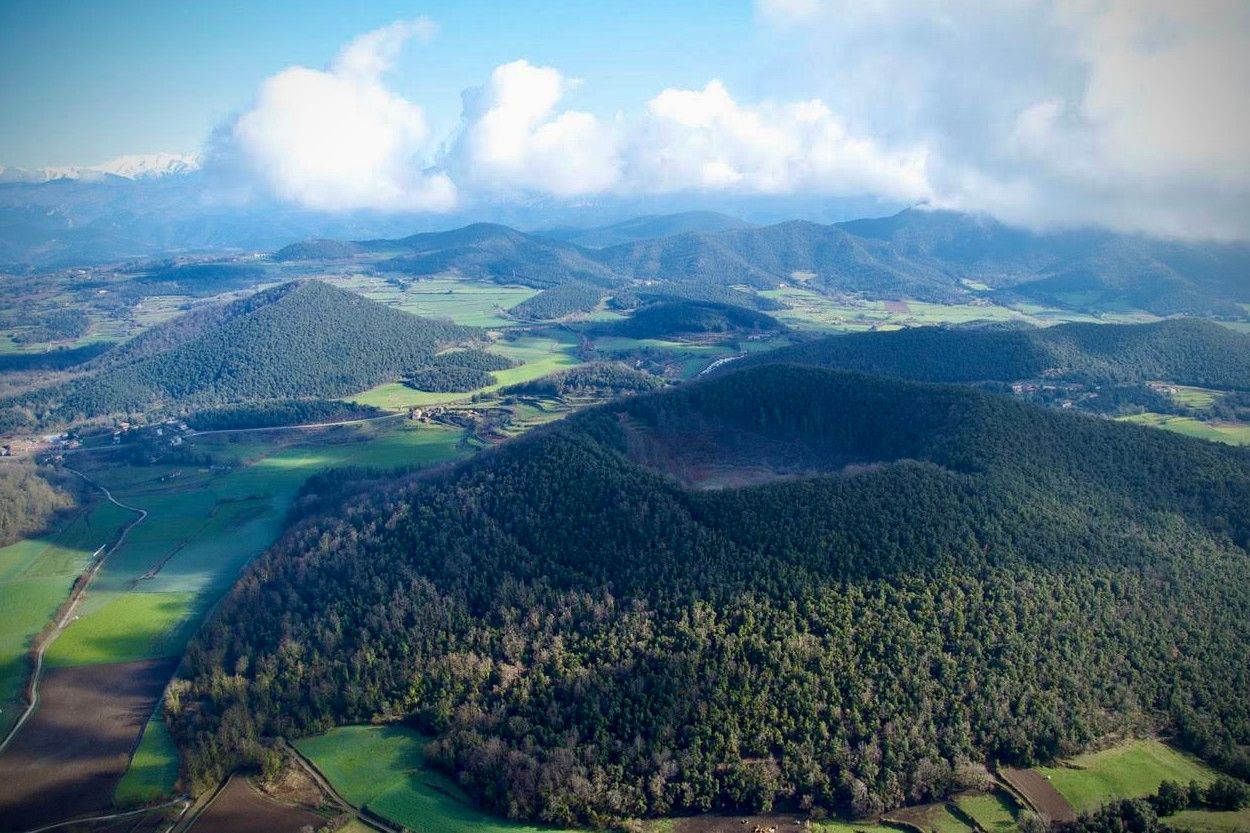 Vista aèria del paisatge de la Garrotxa amb els volcans del Croscat i Santa Margarida. /