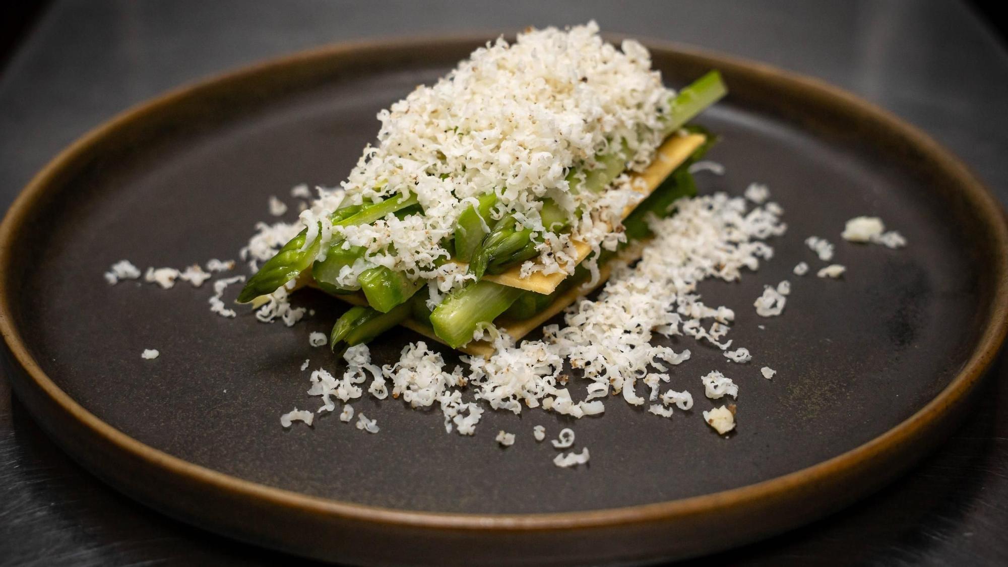 Entro en acció amb el milfulls d’espàrrecs verds i blancs, separats per unes galetes de parmesà i, a sobre, una mousse de pecorino trufat i aquí hi ha saler i estil i pensament gastrorelaxat: el Santi no vol espantar ni tampoc epatar.