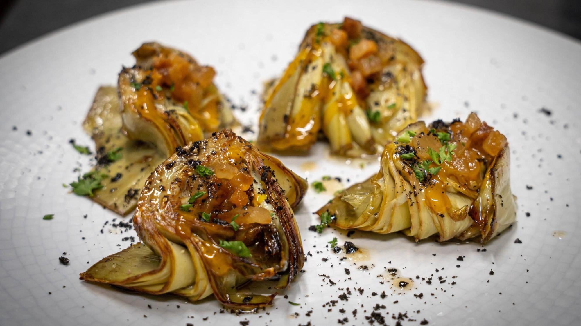 La carxofa és una passada: bullida i a la planxa, ruixada amb rovell i cansalada viada ibèrica i de color d’oliva negra i una vinagreta amb dashi i fumada. «Feta com abans: submergint carbó en oli», explica el xef.