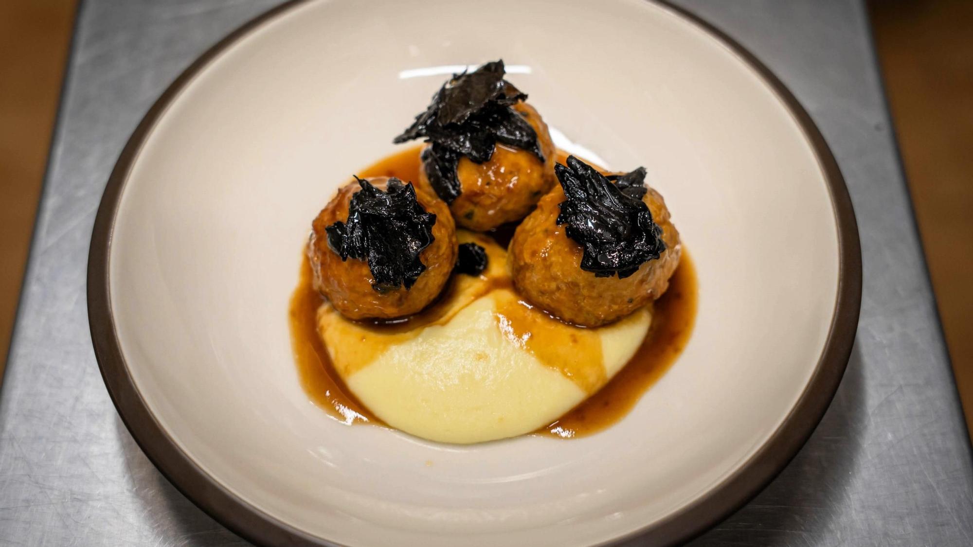 Les mandonguilles de pintada –i una petita proporció de pollastre i cansalada– treuen de la monotonia la rodonesa i troben un coixí a la parmentier i el contrapunt, a les trompetes de la mort. Ah, el pastís de llimona amb escuma de iogurt, galeta i merenga seca.