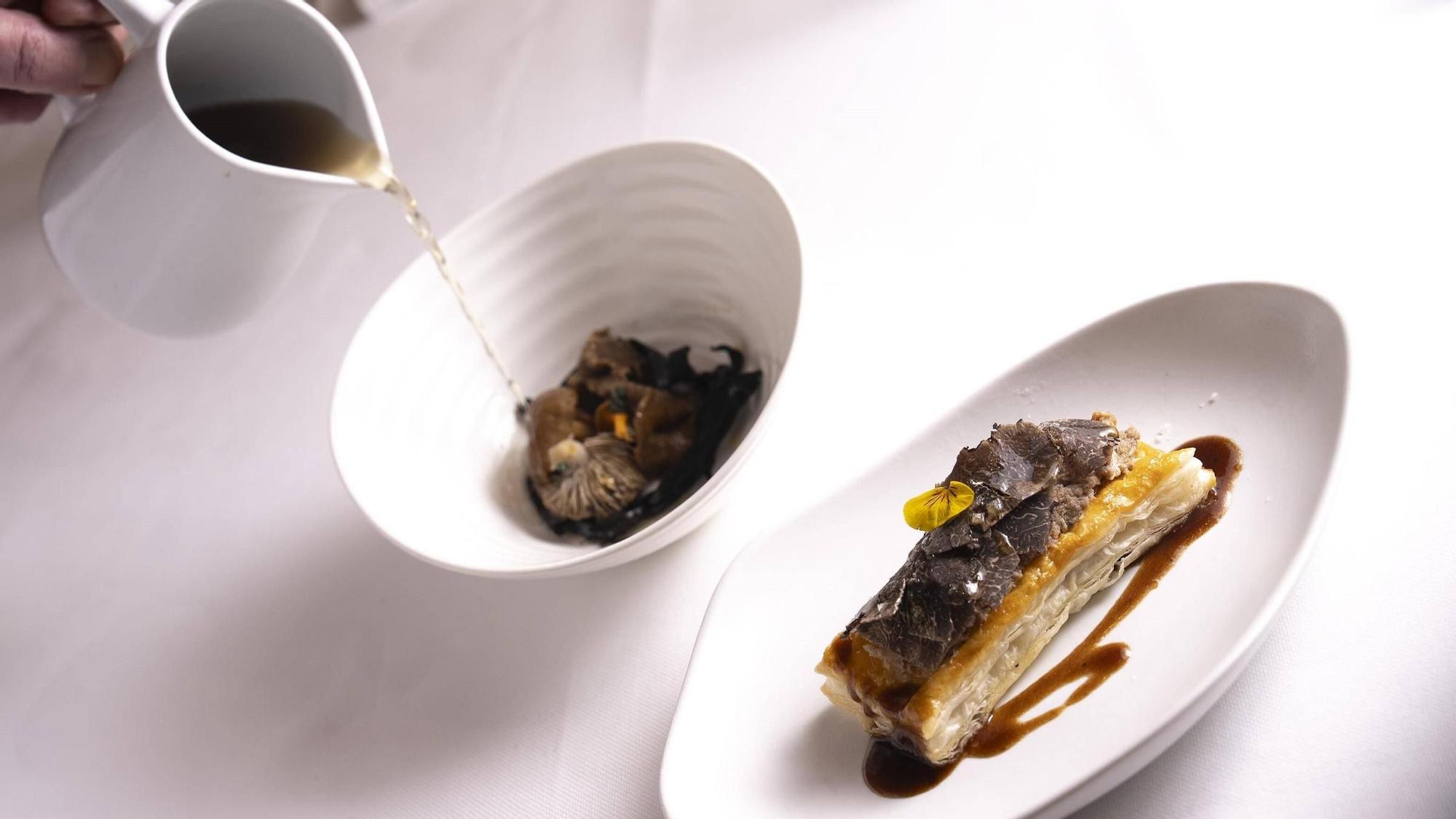La pasta fullada amb perdiu i consomé de bolets en Tram-Tram. /