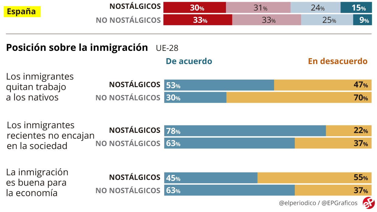 El sondeig també suggereix que els que pensen que el món solia ser millor en el passat tendeixen a ser més negatius pel que fa a laimmigració. Per exemple, entre els anomenats ‘nostàlgics’, el 53% estan d’acord que “els immigrants roben els llocs de treball als nadius”, el 78% que “no es volen integrar a la societat” i el 27% no volen tenir-los com a veïns. Sobre lesprioritats polítiques, el 60% dels que senten nostàlgia opinen que la primera hauria de ser la lluita contra el terrorisme, el 51% aposta per la gestió de la immigració i el 43% opta per la protecció dels drets dels ciutadans.