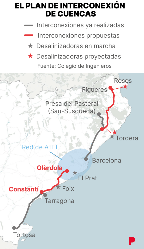 «Tot i així, és urgent accelerar la licitació de les dessalinitzadores de Blanes (Tordera II) i de Cunit (Foix), que acumulen com a mínim un any de retard», avisa Carles Conill, el president de l’observatori de l’aigua de les escoles d’enginyers. Però a més de les «fàbriques d’aigua prevista», els enginyers i economistes reclamen al Govern afrontar la construcció de noves canonades per interconnectar tot Catalunya, una intenció que en el dia d’avui no és a l’agenda del Govern.