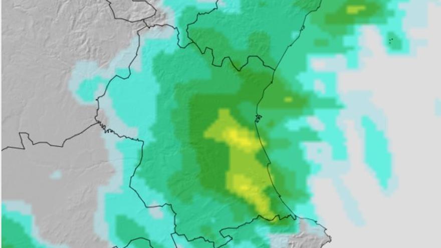 Els models predictius de l’Aemet estimen que podrien caure més de 120 litres per metre quadrat a l’Horta Sud, el Camp de Túria i la Foia de Bunyol