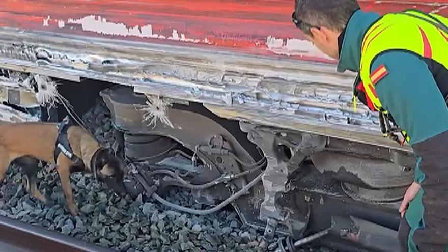 Un agent rastreja amb un gos l’exterior d’un dels vagons, dimarts passat. | GUÀRDIA CIVIL /