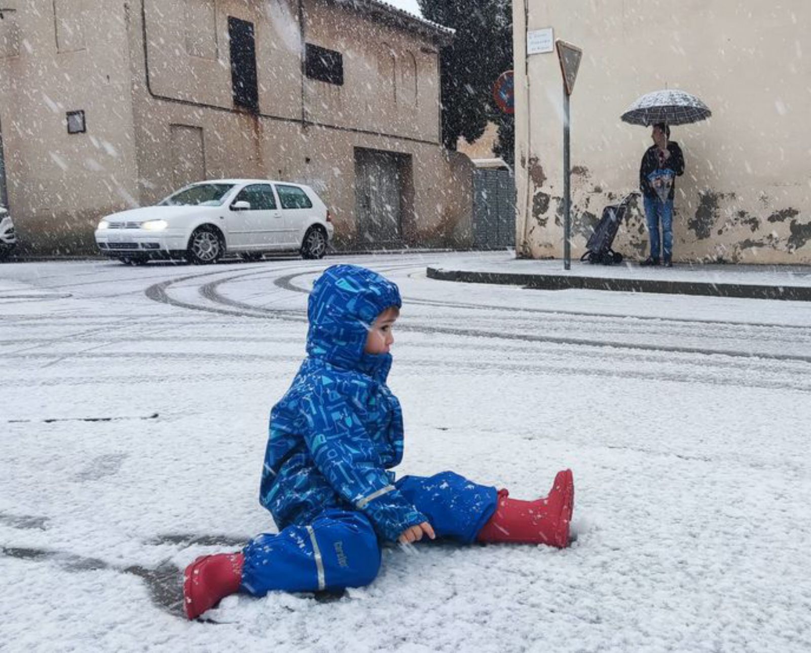 Un nen, enmig de la neu. /