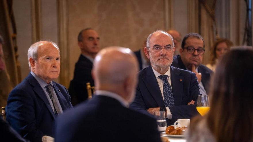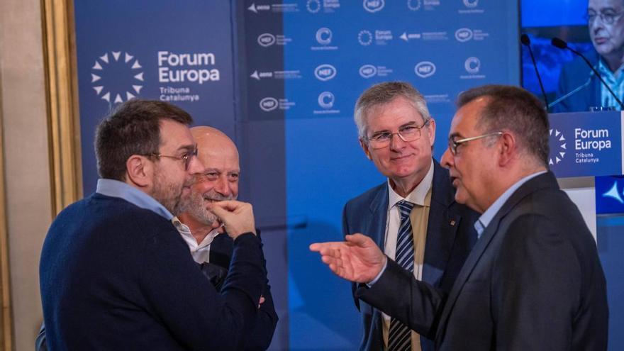 El conseller de Unió Europea i Acció Exterior, Jaume Duch, i l’expresident de la Generalitat, José Montilla, durant el col·loqui. /