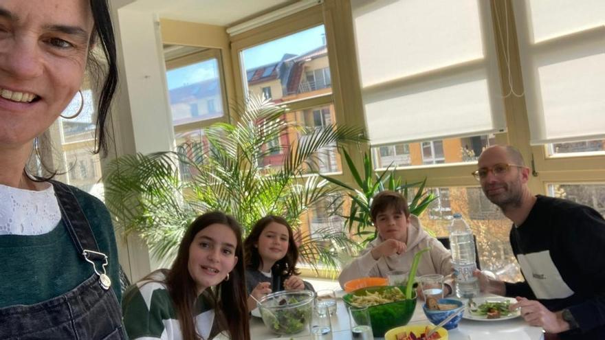 La Laura, el Jordi i els seus fills Iker, Lola i Clara disfrutant un dinar en una casa d’intercanvi a Berlín. /