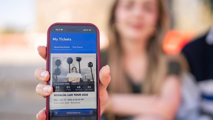 La Laia mostra al mòbil la seva entrada per al concert de Rosalía d’aquest dilluns a Barcelona. /