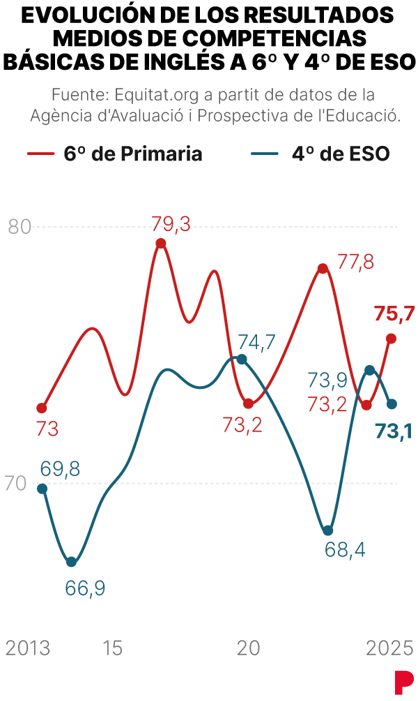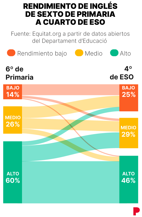 L’evolució entre sisè de primària i quart d’ESO mostra, a més, un deteriorament significatiu: el percentatge d’estudiants amb baix nivell d’anglès gairebé es duplica, al passar del 14% al 25%, mentre que l’alumnat amb nivell alt cau del 60% al 46%.