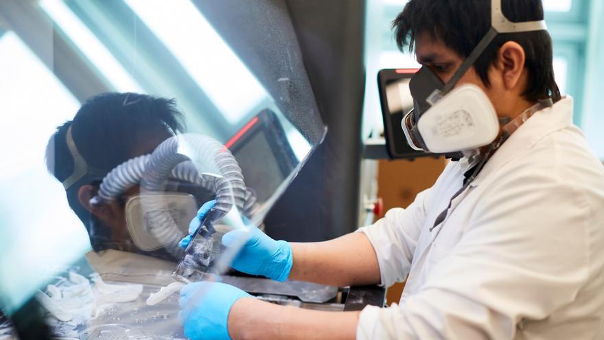 Un tècnic treballa en la fabricació, en impressores de 3D, de components per a un respirador desenvolupat pel Consorci de la Zona Franca, HP, Leitat i CatSalut. /