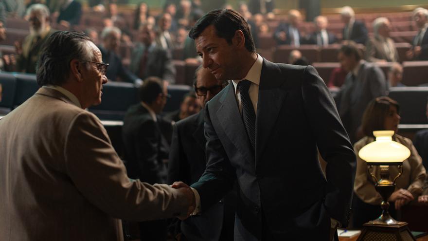 Álvaro Morte, com a Suárez, i Eduard Fernández, com a Santiago Carrillo. /