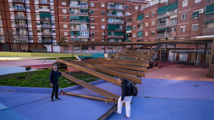 Pèrgola caiguda a la plaça de la Dona de Badalona pel fort vent d’aquest dijous /